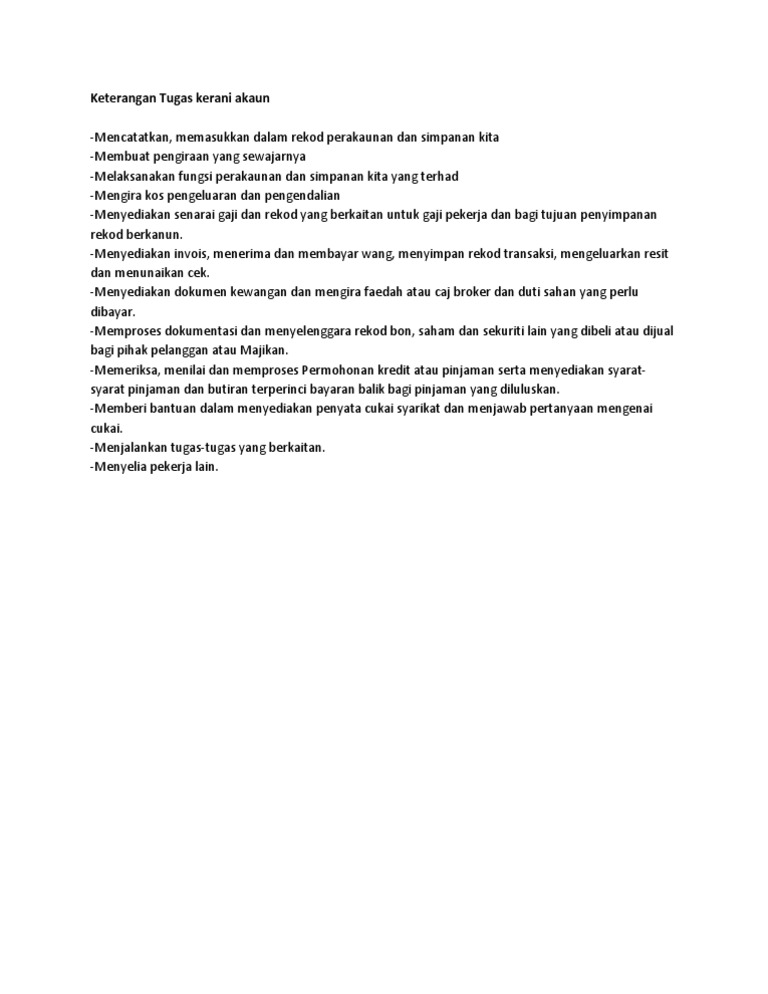 Job description kerani akaun diperlukan. Manfaat program kartu pra kerja. Pengenalan pakaian seragam bahagian perlindungan sumber, jabatan perikanan malaysia. Membantu mengurus akaun fanpage fb dan ig syarikat applescarf. Saya bermnt tawaran anda kerja sbg kerani ni nom saya. Kerani pinjaman adalah jenis kerani bank biasa. Kerani, human resources specialist, kerani am and more on indeed.com. Berdasark berdasarkan an surat pekelili pekeliling ng ikhtisa ikhtisass bil. Apakah kerani akaun, apa sebenarnya yang mereka lakukan dan berapa banyak yang boleh mereka perolehi? Kerja kosong kerani akaun (account clerk) diperlukan segera. Contohnya projek yang memerlukan kepakaran atau teknologi tinggi dalam pembinaan seperti pusat angkasa negara Jangan kalah dalam membantu rakyat tempatan. +ereka perlu menentukan bahawa wang yang dipungut itu tidak disalahgunakan oleh persatuan dan kelab.