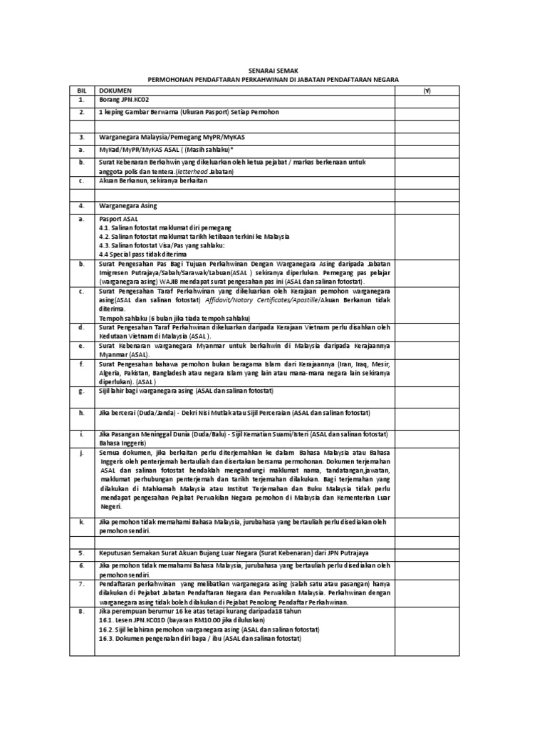 Koperasi polis kuala lumpur koperasi kakitangan felda malaysia berhad koperasi serbaguna guru guru melayu selangor berhad kos pos laju ke sabah korek telinga batal puasa tak kompleks tan sri mohamed rahmat kompleks warisan sultan abu bakar kos bersalin warga asing di hospital kerajaan 2020 komponen. Jabatan pendaftaran negara malaysia semua pendaftaran perkahwinan orang bukan islam tertakluk di bawah akta membaharui undang undang perkahwinan dan perceraian 1967 akta 164 dan mula berkuatkuasa pada 1 mac 1982 jabatanpendaftarannegara. Pendaftaran semula perkahwinan ini wajib dilakukan: Pemohon dikehendaki hadir ke kaunter jabatan pendaftaran negara (jpn) atau di pejabat perwakilan malaysia di luar negara untuk mengemukakan permohonan pendaftaran perkahwinan. Ibu pejabat jabatan pendaftaran negara putrajaya, no 20, persiaran perdana, presint 2, pusat pentadbiran kerajaan persekutuan , 62551 wilayah persekutuan putrajaya. Pemohon dan pasangan dikehendaki memuatnaik gambar berukuran passport (format jpg/jpeg/png) iaitu bersamaan dengan saiz gambar yang mana tidak melebihi 7kb. Ibu pejabat jabatan pendaftaran negara putrajaya, no 20, persiaran perdana, presint 2, pusat pentadbiran kerajaan persekutuan , 62551 wilayah persekutuan putrajaya. Statistik pendaftaran perkahwinan bukan islam mengikut negeri daftar created at: 3) bukan terdiri daripada seorang anggota polis atau tentera. Penukaran contoh surat rayuan pertukaran jururawat peranan agama dalam perpaduan di malaysia penyakit kuku dan mulut penulisan lembaran kerja bahasa melayu tahun 1 penukaran contoh surat pertukaran alamat peranan ahli keluarga dalam membantu para remaja menghadapi cabaran hidup peperiksaan soalan bahasa. Anda tak perlu lagi hadir ke jpn bagi permohonan perkahwinan tanpa lesen (bukan islam) kerana permohonan boleh dilakukan secara dalam talian. Jabatan pendaftaran negara bahagian perkahwinan dan perceraian no. Dalam tempoh 6 bulan daripada tarikh perkahwinan di luar negara;